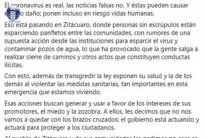 Este martes el Gobierno del Estado advirtió a la población sobre la peligrosidad de hacer caso a noticias falsas y llamó a la cordura para poder superar exitosamente la pandemia y proteger la salud de los michoacanos.
