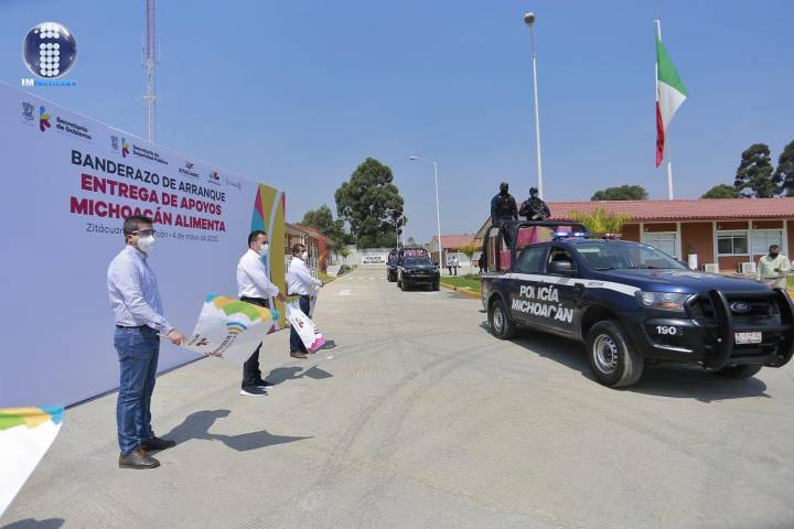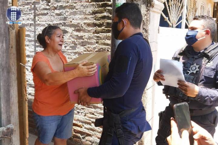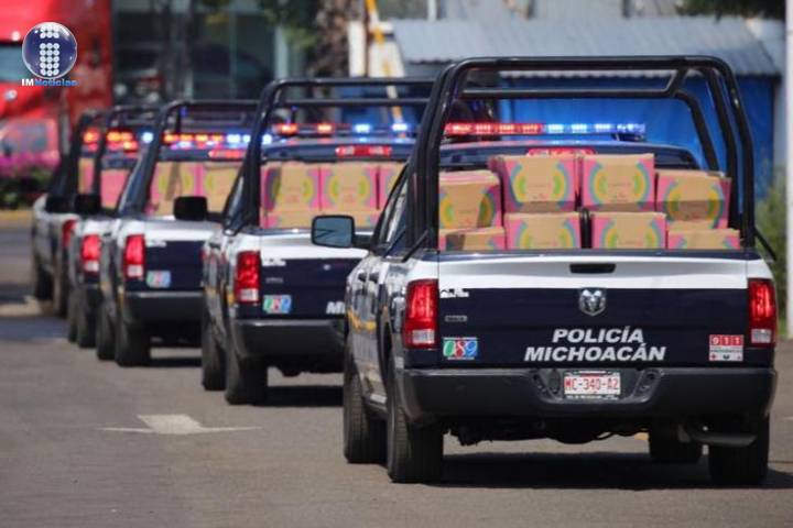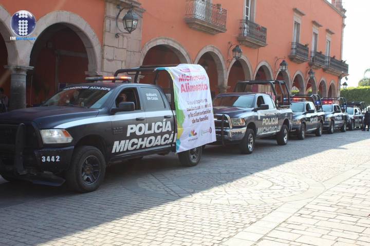 Con apoyo de las unidades y elementos de la Policía Michoacán, la ayuda alimentaria está siendo entregada casa por casa en los 113 municipios del estado.