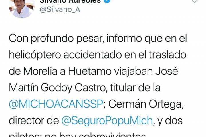 Poco antes de las 10:00 horas se perdió comunicación con un helicóptero del Gobierno del Estado, el cual despegó de Morelia para trasladarse al municipio de Huetamo, en donde se puso en marcha el Programa de Salud para los Policías, evento que encabezó el Gobernador Silvano Aureoles Conejo.