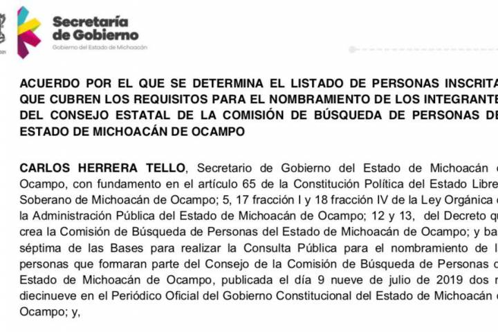 NOTICIAS 31/07/2019Publica Segob lista de inscritos para consejeros de la Comisión de Búsqueda Tras el levantamiento del acta de cierre de registro del pasado 26 de julio, que estipulan las bases para realizar la Consulta Pública para el nombramiento de las personas que fungirán como consejeros estatales de la Comisión de Búsqueda de Personas del Estado de Michoacán de Ocampo, la Secretaría de Gobierno, informa que durante la recepción de documentos se obtuvieron cinco propuestas en las personas de: