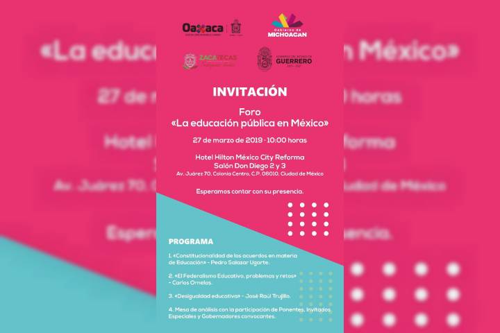 NOTICIAS 26/03/2019Convocan Michoacán, Guerrero, Oaxaca y Zacatecas a Foro sobre la educación pública en México Con la convicción de trabajar a favor del derecho educativo de la niñez, los Gobiernos de Michoacán, Guerrero, Oaxaca y Zacatecas convocan este miércoles al Foro Nacional "La Educación Pública en México", que se llevará a cabo en la capital del paÃs.