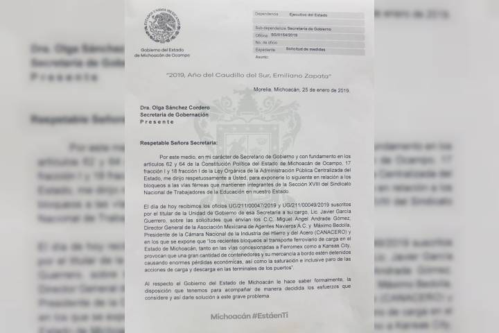 NOTICIAS 26/01/2019Formaliza Gobierno de Michoacán petición a Segob para liberar vías férreasEl Gobierno de Michoacán solicitó de manera formal al Gobierno de la República la liberación de las vías férreas, las cuales cumplen hoy 12 días obstruidas por el magisterio provocando severas afectaciones económicas y a la vida de las michoacanas y los michoacanos.