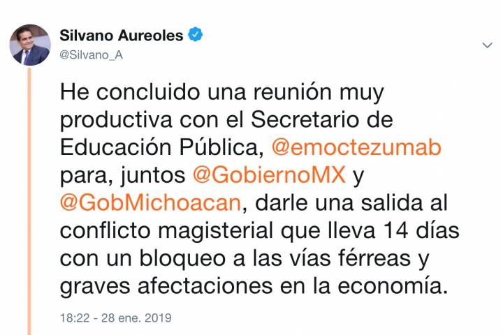NOTICIAS 28/01/2019Acuerdan Gobernador y SEP ruta para solucionar conflicto magisterial El Gobernador Silvano Aureoles Conejo y el Secretario de Educación Pública, Esteban Moctezuma Barragán, acordaron hoy trabajar en una misma línea y ruta para lograr una solución al conflicto magisterial, el cual ha provocado un bloqueo a las vías ferroviarias con graves afectaciones a Michoacán y al país.