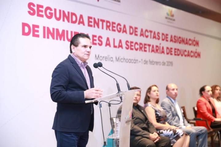NOTICIAS 01/02/2019Da Gobernador certeza jurídica a 68 escuelas públicas de MichoacánEn seguimiento al compromiso de acabar con la irregularidad escolar que enfrentaba el estado desde hace más de 10 años y ofrecer una mejor educación a las niñas, niños y jóvenes en Michoacán, el Gobernador Constitucional Silvano Aureoles Conejo, hizo la segunda entrega de más 60 actas de asignación de inmuebles a la Secretaría de Educación del Estado, para escuelas de preescolar, primarias y secundarias, en beneficio de más de 12 mil ... Ver más...