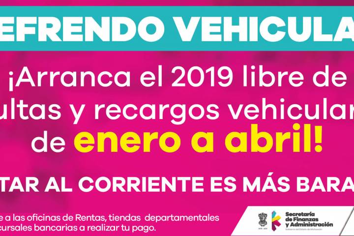 NOTICIAS 01/01/2019Del 2 de enero al 30 de abril, periodo ordinario de pago de Refrendo Vehicular 2019: SFAEl periodo de pago de la contribución correspondiente al Refrendo Vehicular 2019 iniciará el miércoles 2 de enero y tendrá vigencia hasta el martes 30 de abril de 2019.