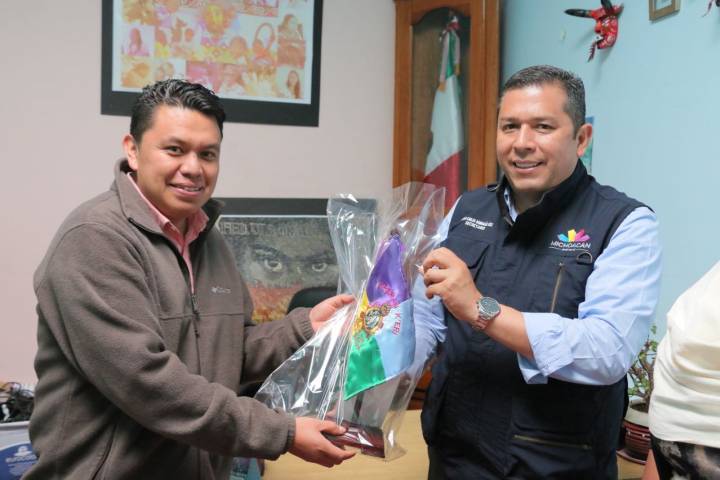 NOTICIAS 14/05/2018Entrega bandera purhépechaEn señal de respeto y reconocimiento al apoyo ofrecido a las comunidades de la Meseta Purépecha, esta mañana el líder del Concejo Comunal de Cherán, Pedro Chávez Sánchez, entregó la Bandera Purépecha al secretario de Desarrollo Social y Humano, Juan Carlos Barragán, quien agradeció el gesto y reiteró su respeto y compromiso de trabajo para las comunidades originarias de Michoacán.... Ver más...