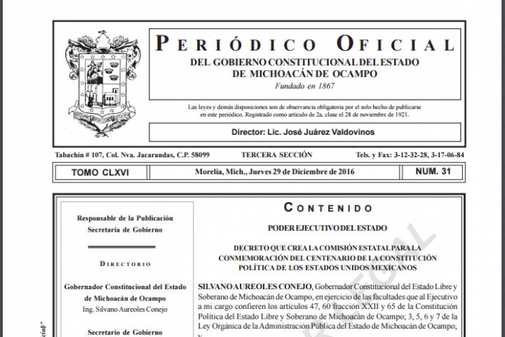 Fue publicado el Decreto para la creación de la Comisión Estatal para la Conmemoración del Centenario de la Constitución Política de los Estados Unidos Mexicanos, misma que se encargará de coordinar las actividades en relación a los 100 años de la promulgación de la Carta Magna.