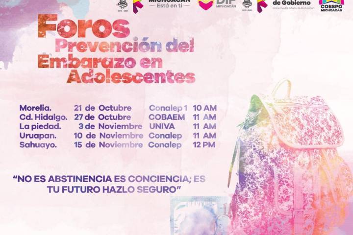 NOTICIAS 21/10/2016Segob continúa con acciones en favor de los jóvenes michoacanos En continuación a la ejecución de políticas públicas que beneficien a los jóvenes a estar informados sobre los riesgos del embarazo a temprana edad, la secretaría de Gobierno, a través del Consejo Estatal de Población (Coespo), instaló el foro sobre la Prevención del Embarazo en Adolescentes, en esta ocasión, la sede fue el Colegio Nacional de Educación Profesional Técnica (Conalep) plantel Morelia.