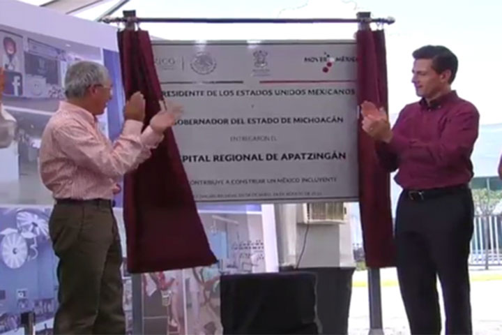 El gobernador Salvador Jara Guerrero y el presidente Enrique Peña Nieto, inauguraron el nuevo Hospital Regional de Apatzingán "Bicentenario de la Constitución", el compromiso presidencial número 154 y con el que Michoacán se coloca como una de las entidades con mayor inversión en infraestructura y equipamiento de salud a nivel nacional, al sumar más de 2 mil millones de pesos de inversión federal en este rubro.