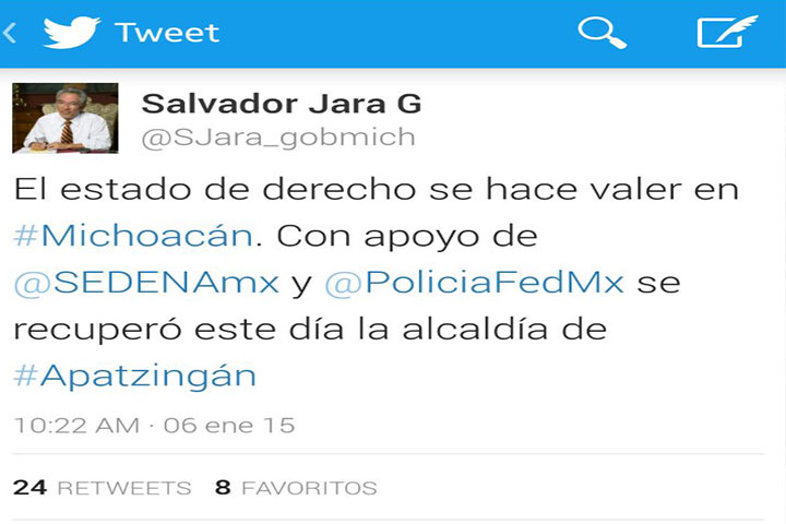 NOTICIAS 06/01/2015El estado de derecho se hace valer en Michoacán: Jara "El estado de derecho se hace valer en #Michoacán. Con apoyo de @SEDENAmx y @PoliciaFedMx se recuperó este día la alcaldía de #Apatzingán", escribió el gobernador Salvador Jara Guerrero en su cuenta de twitter tras el enfrentamiento suscitado esta madrugada en la Alcaldía de Apatzingán.