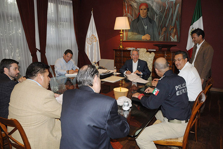 El gobernador Salvador Jara Guerrero, convocó al Gabinete de Seguridad estatal conformado por Carlos Hugo Castellanos Becerra, secretario de Seguridad Pública; Bernardo Trelles Duarte, vocal ejecutivo del Sistema Estatal de Seguridad Pública y Jaime DarÃo Oseguera Méndez, secretario de Gobierno; asà como al presidente municipal de Morelia, Wilfrido Lázaro Medina, para revisar las acciones de combate a la violencia y la delincuencia que s... Ver más...