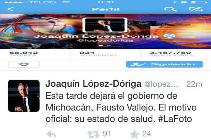 NOTICIAS 18/06/2014Ya se lo informó a López Dóriga: Fausto deja el cargo"Está tarde dejará el gobierno de Michoacán, Fausto Vallejo. El motivo oficial: su estado de salud. #LaFoto", escribió en su cuenta de twitter el periodista Joaquín López Dóriga hace unos momentos.