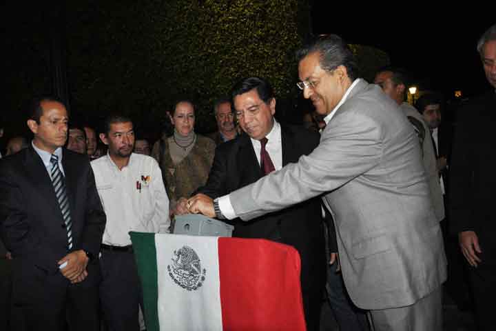 El gobernador del estado, Jesús Reyna García, acompañado del alcalde de Morelia, Wilfrido Lázaro Medina, presidió la Iluminación Escénica de las Fiestas Patrias 2013 en el Centro Histórico de esta ciudad capital.