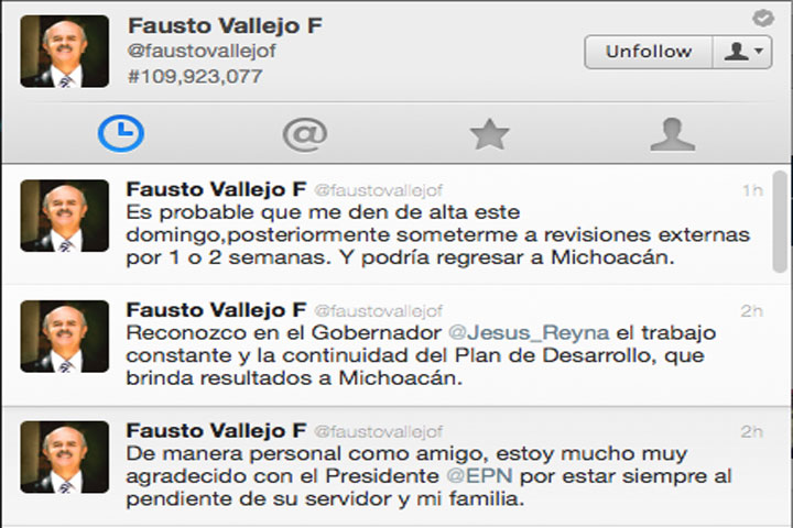 Fausto Vallejo Figueroa, gobernador con licencia, podría ser dado de alta del hospita,l en la Unión Americana en el que esta siendo atendido, el próximo domingo, según señalo en su cuenta de twitter @faustovallejof la noche de este jueves.