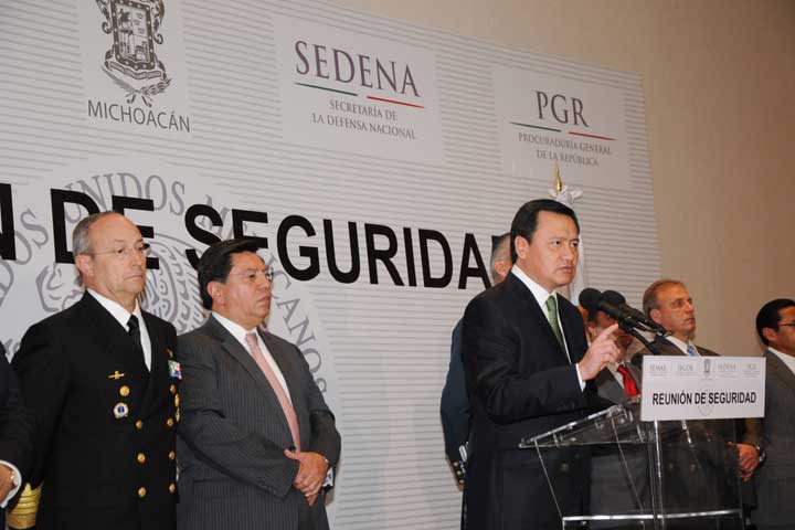 Tras concluir la reunión de seguridad, el secretario de Gobernación, Miguel Ángel Osorio Chong, advirtió que la federación no saldrá de Michoacán hasta que no estén dadas las condiciones de seguridad y que el Gobierno del Estado tenga la fuerza para continuar con la estrategia implementada por el gobierno de Enrique Peña Nieto.