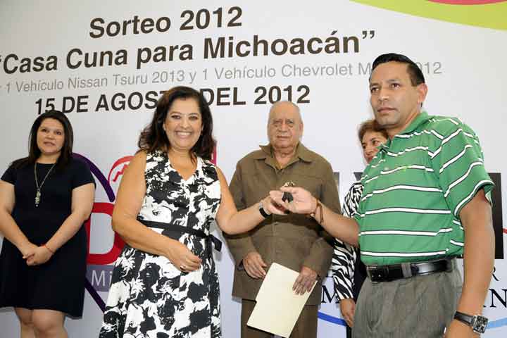 NOTICIAS 05/09/2012Entrega Patricia Mora vehículos a ganadores del sorteo "Casa Cuna para Michoacán"La presidenta del Sistema DIF Michoacán, Patricia Mora de Vallejo, entregó los dos vehículos que formaron parte del Sorteo 2012 "Casa Cuna para Michoacán" y cuyos recursos obtenidos se destinarán para la construcción de este inmueble a beneficio de niños en estado vulnerable.
