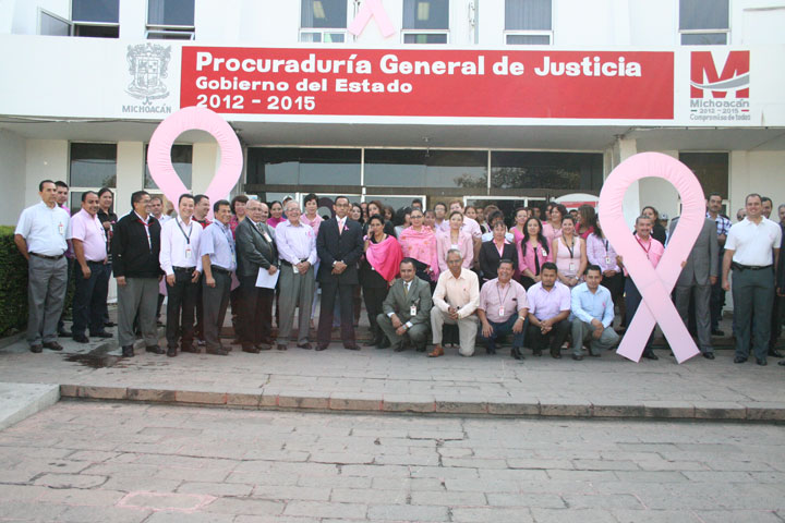 NOTICIAS 19/10/2012Procuraduria también luchando contra el cáncer de mamaCon una entusiasta y activa concientización fue celebrado el "Día Internacional de Lucha contra el Cáncer de Mama" por el todo el personal de la Procuraduría General de Justicia, cuyas acciones de difusión promovidas por el gobierno del estado han contribuido para impulsar la prevención y detección temprana de esta enfermedad entre las mujeres michoacanas.