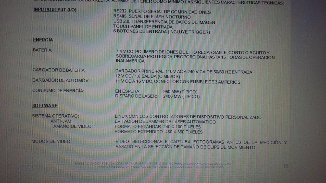 | Especificaciones técnicas de los equipos exactamente iguales las que se piden en las bases a las que tiene en su página web la empresa Redflex. |