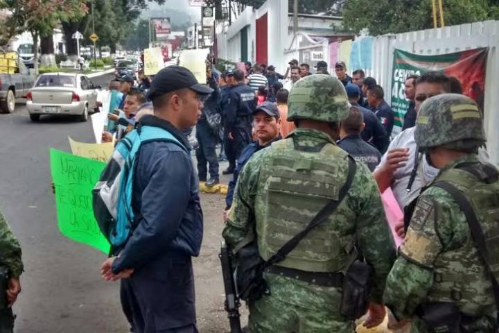 Un grupo de elementos de la Policía Municipal, se manifestaron en el acceso principal de la presidencia municipal, plantean una serie de demandas y diálogo directo con el alcalde Víctor Manuel Manríquez.