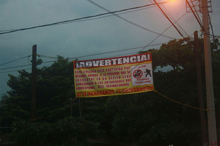 Cinco lonas fueron colocadas por los vecinos de la colonia Penjamo, perteneciente a esta ciudad de Apatzingán, como advertencia para los delincuentes, ya que una gran cantidad de asaltos se han registrado en la zona.