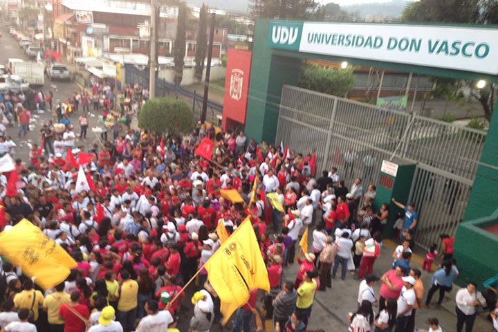 Seguidores los candidatos del PAN y del PRI a la alcaldÃa local protagonizaron una riña en medio del debate de los aspirantes a la Presidencia Municipal, el cual se celebró en la Universidad Don Vasco, de esta ciudad; la pelea fue a las afueras de las instalaciones educativas.