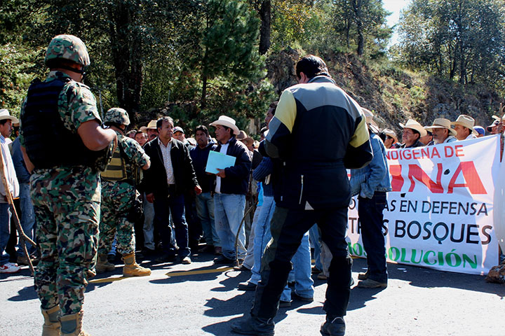 Habitantes de la comunidad indígena de Sevina, se manifiesta en contra de sus vecinos de Comachuén, por el robo y tala clandestina de sus bosques; ambas defienden su patrimonio y han intentado tomar la sede de la alcaldía; cada una de ellas mantiene bloqueos carreteros en esta región de la Meseta Purhépecha y se teme un posible enfrentamiento.