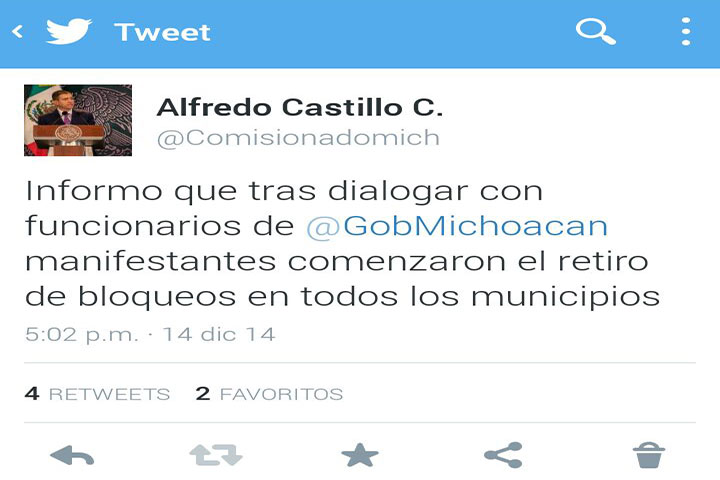 "Informo que tras dialogar con funcionarios de @GobMichoacan manifestantes comenzaron el retiro de bloqueos en todos los municipios", escribió.