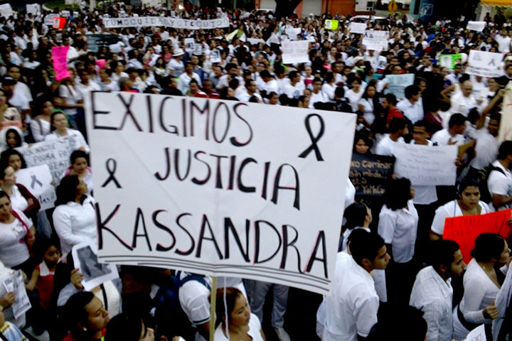 Decenas, cientos, miles de habitantes de esta localidad, marcharon vestidos de blanco y portando veladoras, cartulinas y lonas, por varias calles gritando consignas contra las autoridades de gobierno y exigiendo justicia por el asesinato de la joven enfermera Kassandra; un grupo de profesores "democráticos", trató de desviar la manifestación pacífica, pero familiares de la víctima se opusieron y decidieron dirigirse hacia otro lugar.