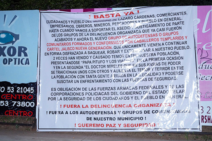 Dos lonas dirigidas a la ciudadanía en general en las que rechazan a los grupos de la delincuencia organizada y de autodefensas, fueron colocadas en distintos puntos de las avenidas Melchor Ocampo y Tulipanes de esta ciudad portuaria.