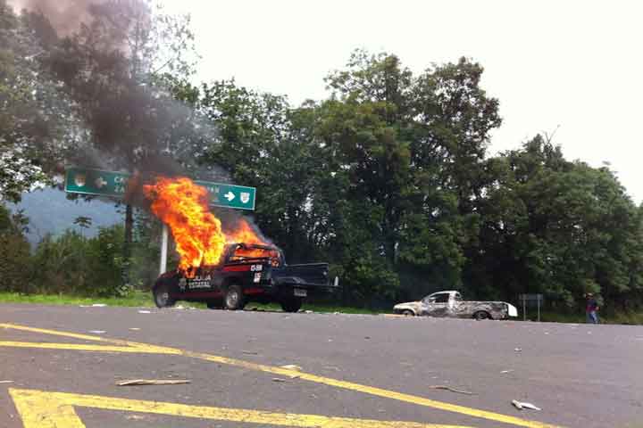 Encapuchados y a bordo de varias camionetas, presuntamente indígenas de Capacuaro atacaron instalaciones de dependencias estatales, secuestraron e incendiaron vehículos, en la carretera federal 37 Carapan-Playa Azul, a la altura de la desviación a Los Reyes en donde mantienen un bloqueo.