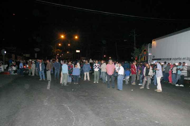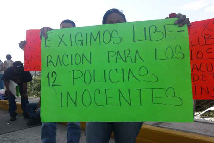 Un grupo de familiares de los doce elementos de la Policía Municipal de Tingambato que fueron detenidos tras el enfrentamiento a balazos a la altura de San Juan Tumbio, se manifestaron este día en la caseta de cobro de San Ángel Zurumucapio, municipio de Ziracuaretiro, quienes exigen la liberación de los uniformados aduciendo que son inocentes.