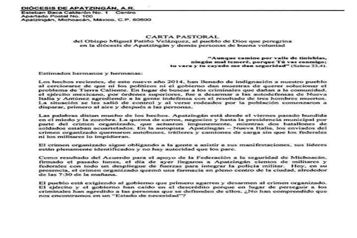 NOTICIAS 16/01/2014En carta, Obispo de Apatzingán acusa al gobierno federal de agredir a inocentes