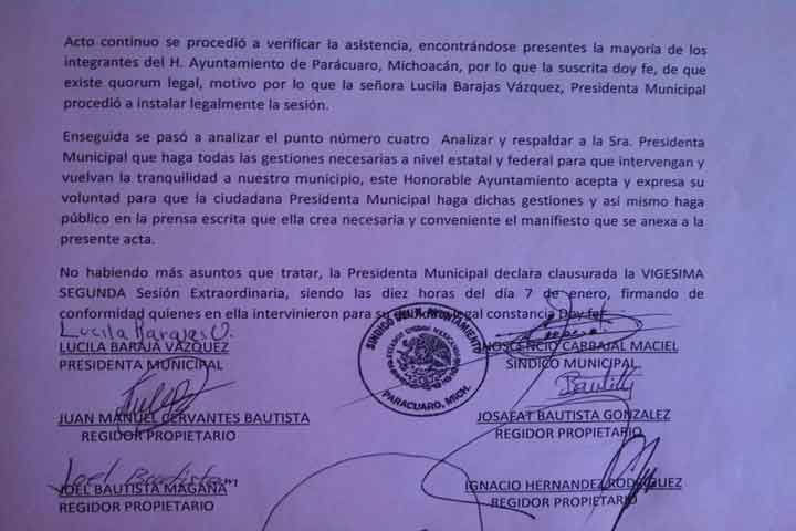 El Cabildo de Parácuaro realizó una Sesión Extraordinaria en la Tenencia de Antúnez, para expresar su respaldo a la alcaldesa, Lucila Barajas Vázquez y de esta forma autorizar que la presidenta haga todas las gestiones necesarias a nivel estatal y federal, para solicitar que los guardias de autodefensa sean expulsados de esta demarcación, de acuerdo con un documento oficial emitido por el mismo Ayuntamiento.