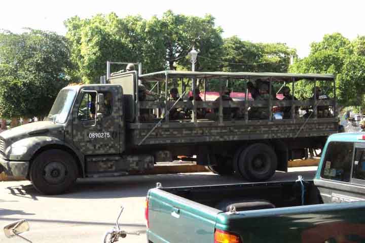 Desde temprana hora, se vio circular por las calles de esta localidad a los elementos castrenses, quienes patrullan la zona a bordo de camiones Mercedes Benz y camionetas pick-up.