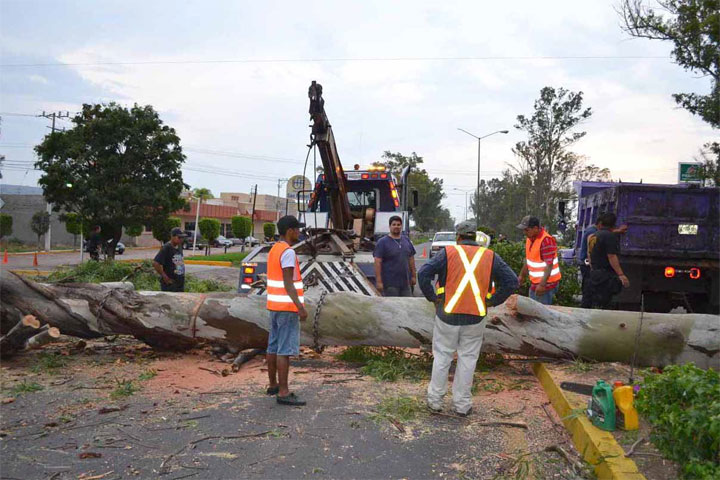 Un árbol de eucalipto de más de 40 metros de altura cedió ante los embates del viento y de las lluvias, y cayó en la Carretera Nacional, tramo Jiquilpan - Sahuayo, donde por fortuna no hubo vehículos afectados ni personas lesionadas o fallecidas.