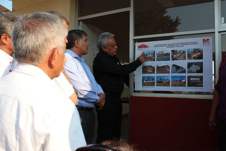 El secretario de Educación en Michoacán, J. Jesús Sierra Arias y el director del Instituto de Infraestructura Física Educativa del Estado de Michoacán (IIFEEM), Lino Gasca Aburto, acompañados por el edil uruapense Aldo Macías Alejandres, inauguraron tres aulas en las Escuela Primaria "Francisco Villa", de la colonia Río Volga de este municipio, acción en la que se invirtió cerca de un millón de pesos en beneficio de alrededor de mil ... Ver más...
