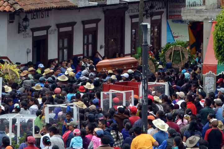Miles de personas, entre hombres, mujeres, niños y ancianos, se dieron cita éste mediodía para asistir a la misa de cuerpo presente de los dos comuneros secuestrados y asesinados, posteriormente, como un río humano, los acompañaron hasta su última morada; ahí donde permanecerán por la eternidad abrazos de la tierra que tanto amaron, por la que lucharon y por la que dieron su vida.
