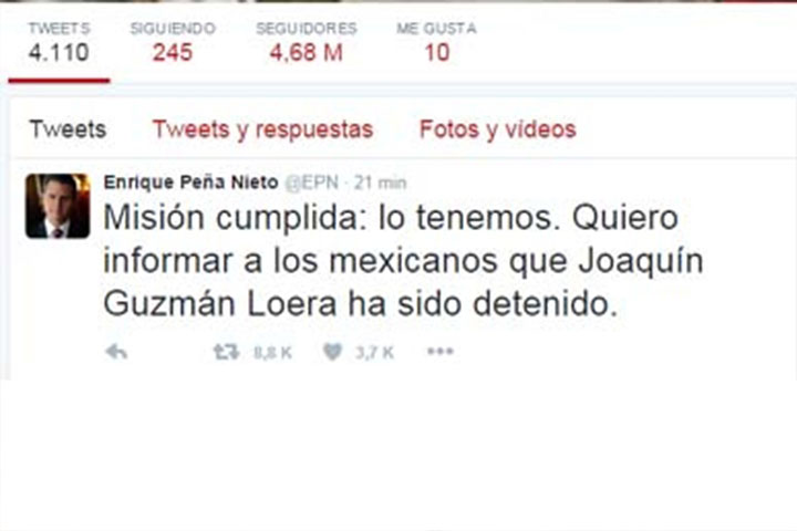 "Misión cumplida: lo tenemos. Quiero informar a los mexicanos que Joaquín Guzmán Loera ha sido detenido", refiere el mensaje publicado a las 12:19 horas de este viernes 8 de enero.