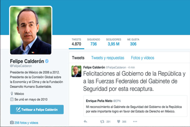 A través de su cuenta de Twitter, @FelipeCalderon, el antecesor de Enrique Peña Nieto, texteó: Felicitaciones al Gobierno de la República y a las Fuerzas Federales del Gabinete de Seguridad por esta recaptura".
