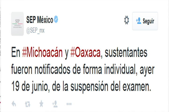 Además, a través de la cuenta de Twitter de la secretaría se informó que también en Michoacán la evaluación no se lleva a cabo.