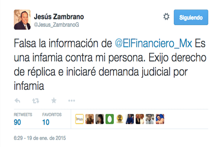 NOTICIAS 19/01/2015Zambrano niega haber recibido dos millones de pesos de Abarca en IgualaNuevo escándalo a través de las páginas de El Financiero se da a conocer a la opinión pública: