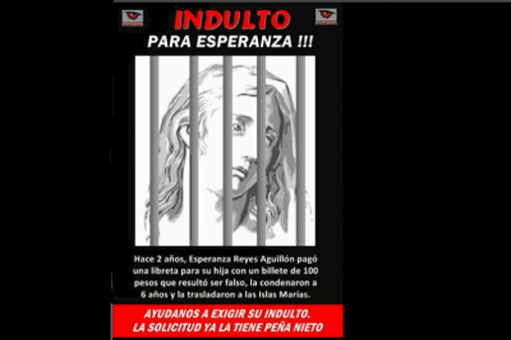 NOTICIAS 16/01/2014Paga con billete falso de 100 pesos, la llevan hasta las Islas Marías y hoy piden indultoEsperanza Reyes Aguillón fue recluida en el penal de La Pila de San Luis Potosí, en espera de que se resuelva un procedimiento de indulto presidencial en su favor.