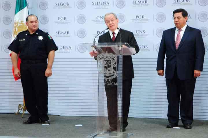 El secretario ejecutivo del Sistema Nacional de Seguridad Pública (SNSP), Monte Alejandro Rubido García, anunció las detenciones de dos supuestos operadores criminales en la Entidad; además de confirmar que policías de Apatzingán recibirán un intensivo adiestramiento y que ministerios públicos federales estarán durante los operativos realizados en el Estado, esto en una rueda de prensa ofrecida en Casa de Gobierno, en esta capital.