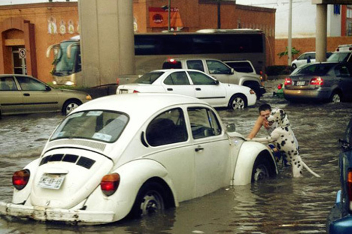 Una prueba de ello se registró en una fotografía del 25 de este mes, donde tras una fuerte lluvia y al circular por una de las tantas calles de San Nicolás de los Garzas, Monterrey Nuevo León, una persona viajaba con su perro en el vehículo.