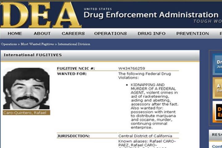 NOTICIAS 10/08/2013DEA preocupada por la liberación del "infame narcotraficante"La Agencia Antidrogas de Estados Unidos (DEA, por sus siglas en inglés) aseguró que continuará vigorosamente sus esfuerzos para asegurarse que Rafael Caro Quintero enfrente los cargos en ese país por los crímenes que ha cometido, incluyendo el asesinato del agente Enrique Camarena.