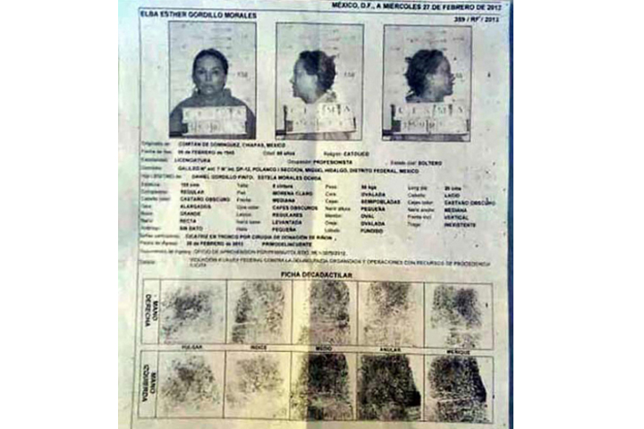 La imagen, que es una fotocopia de la ficha original, muestra tres fotografías de Elba Esther Gordillo en diferentes perfiles.