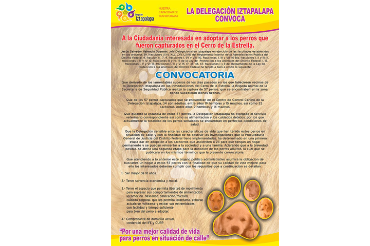 NOTICIAS 14/01/2013Ponen en adopción a perros capturados en IztapalapaLa delegación Iztapalapa emitió la convocatoria para que las personas interesadas en adoptar perros puedan hacerlo con los 57 que fueron capturados en el Cerro de la Estrella.
