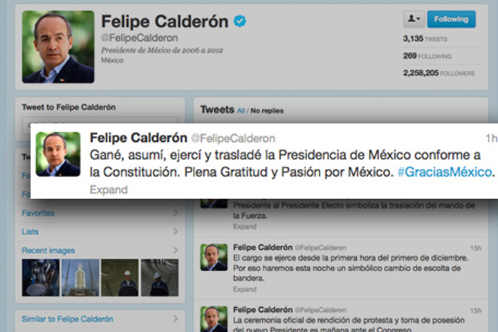 NOTICIAS 01/12/2012A través de Twitter, FCH agradece a MéxicoEl ahora ex presidente de México, Felipe Calderón Hinojosa, informó a través de su cuenta de Twitter que trasladó la Presidencia del país conforme a la Constitución y agradeció una vez más a México.