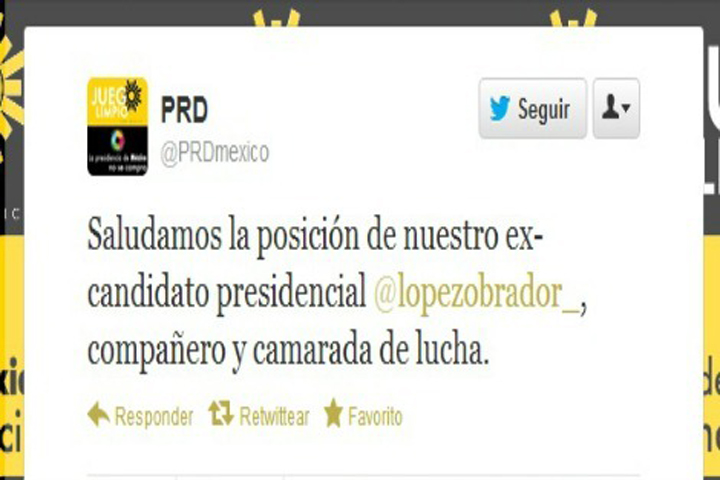 En la cuenta oficial @PRDMexico se tuiteó: "Saludamos la posición de nuestro ex-candidato presidencial @lopezobrador_, compañero y camarada de lucha".