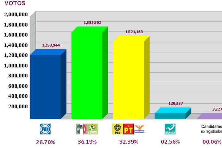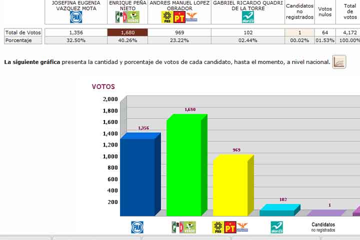NOTICIAS 01/07/2012Tiene Peña Nieto ventaja en conteo rápido: IFEEnrique Peña Nieto, candidato de la coalición Compromiso por México es el ganador en el conteo rápido del IFE con un 37.93 y 38.55 por ciento de los votos, mientras que Andrés Manuel López Obrador de la coalición Movimiento progresista obtuvo un segundo lugar con un porcentaje que oscila entre el 30.90 y 31.86; Josefina Vázquez Mota de Acción Nacional obtuvo un tercer lugar con un porcentaje entre 25.10 y 26.03; y finalmente Gabriel Cua... Ver más...